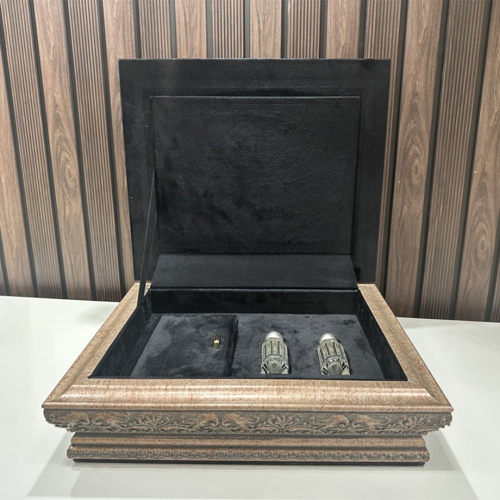 البوكس مصنوع من خامات عالية الجودة ومزين بالقماش الأسود المخملي الفاخر.
